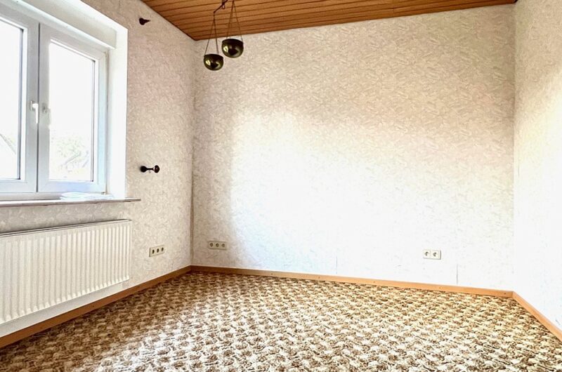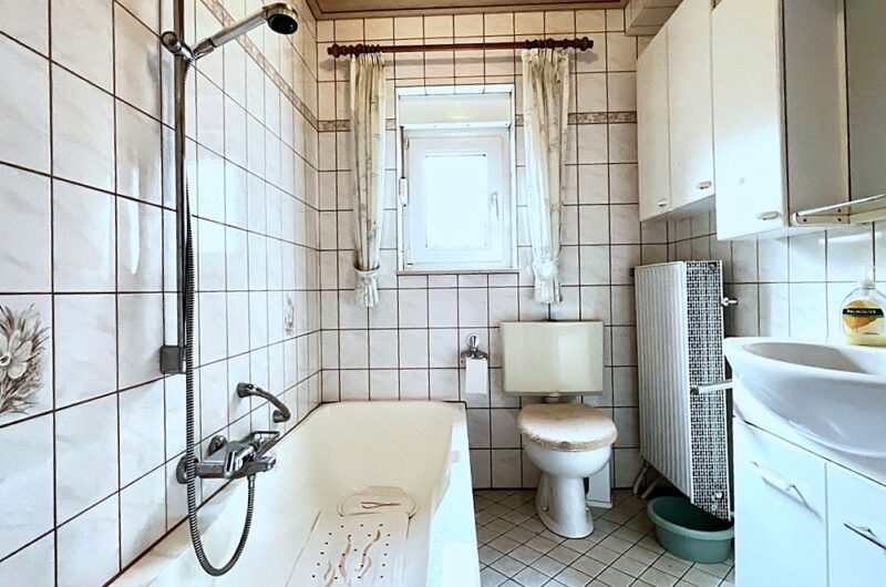 Diese Immobilie bietet im Erdgeschoss des Wohnbereichs ein großzügiges Wohnzimmer mit Zugang zur Südterrasse und Zugang zu einem weiteren Zimmer, das sich als Arbeits- oder Gästezimmer anbietet. Des Weiteren gibt es im Erdgeschoss ein hell gefliestes Wannenbad, das in den 1990er Jahren erneuert wurde sowie eine Küche mit Einbauküche und einem angrenzenden Hauswirtschaftsraum. Letzterer hat ebenfalls einen Zugang zur Terrasse.