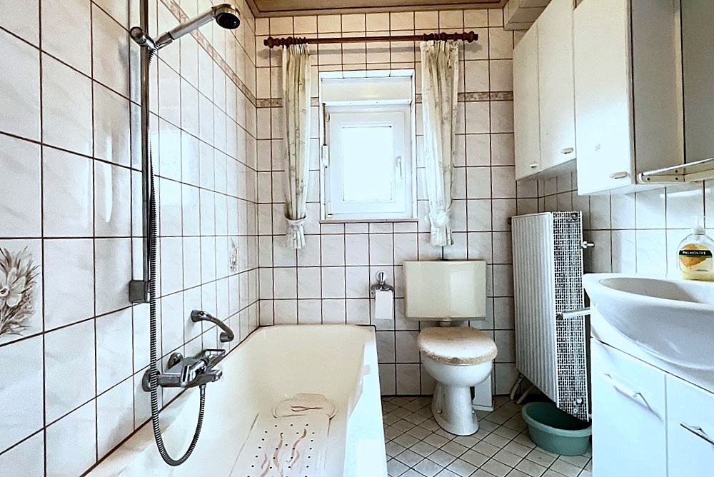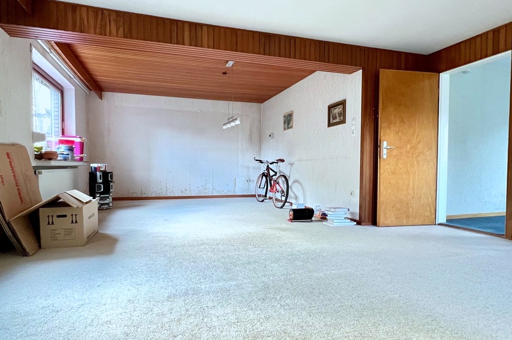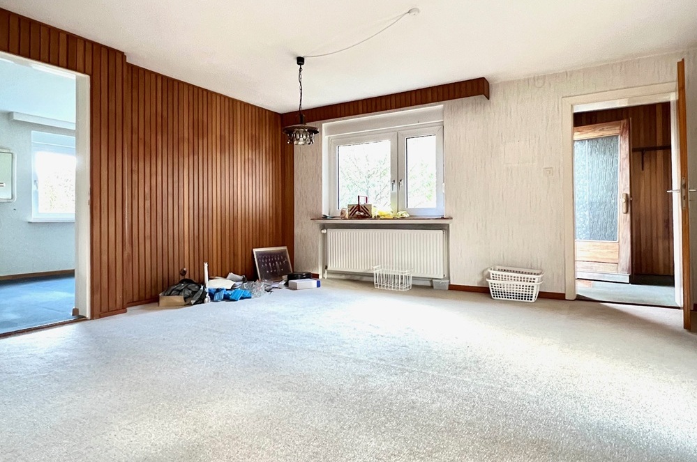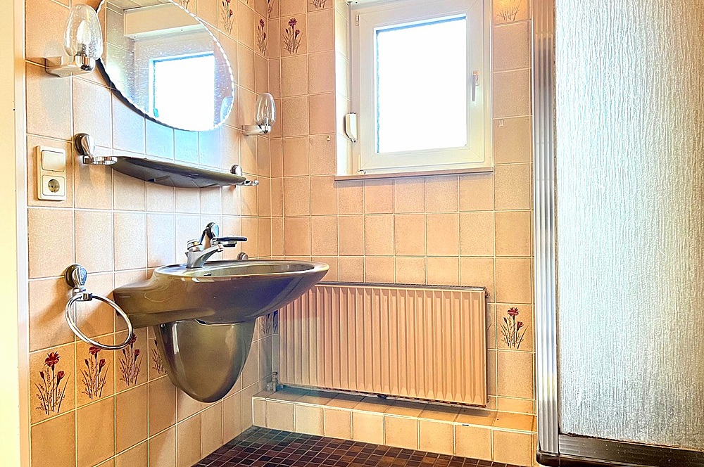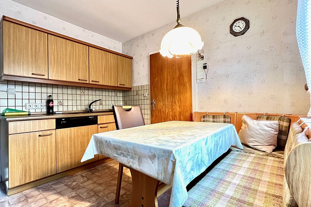 Diese Immobilie bietet im Erdgeschoss des Wohnbereichs ein großzügiges Wohnzimmer mit Zugang zur Südterrasse und Zugang zu einem weiteren Zimmer, das sich als Arbeits- oder Gästezimmer anbietet. Des Weiteren gibt es im Erdgeschoss ein hell gefliestes Wannenbad, das in den 1990er Jahren erneuert wurde sowie eine Küche mit Einbauküche und einem angrenzenden Hauswirtschaftsraum. Letzterer hat ebenfalls einen Zugang zur Terrasse.