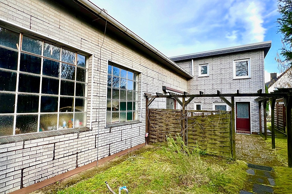 Zusätzlich zum Wohnhaus ist eine große Werkstatt mit Arbeitsgrube und einem großen elektrischen Segmenttor (Hörmann) sowie einem großen Schwingtor aus Holz in das Gebäude integriert. In diesem Teil des Gebäudes gibt es zusätzlich ein kleines WC mit Fenster sowie den Heizungsraum. Auf der Westseite des Hauses befinden sich massiv gemauerte Abstellräume und der Tankraum (derzeit ohne Öltanks, daher ist die Heizung außer Betrieb).