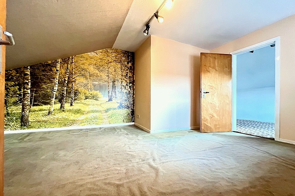 Vom Eingangsbereich führt eine Treppe hinunter in den gefliesten Teilkeller und eine ins Dachgeschoss. Hier befinden sich ein gut geschnittenes Schlafzimmer ohne Dachschrägen, ein Schlafzimmer mit angrenzendem Ankleidezimmer mit Dachschrägen sowie ein Duschbad mit einem dahinterliegenden, kleinen Zimmer, das z. B. genutzt werden könnte um ein großes Badezimmer zu installieren.