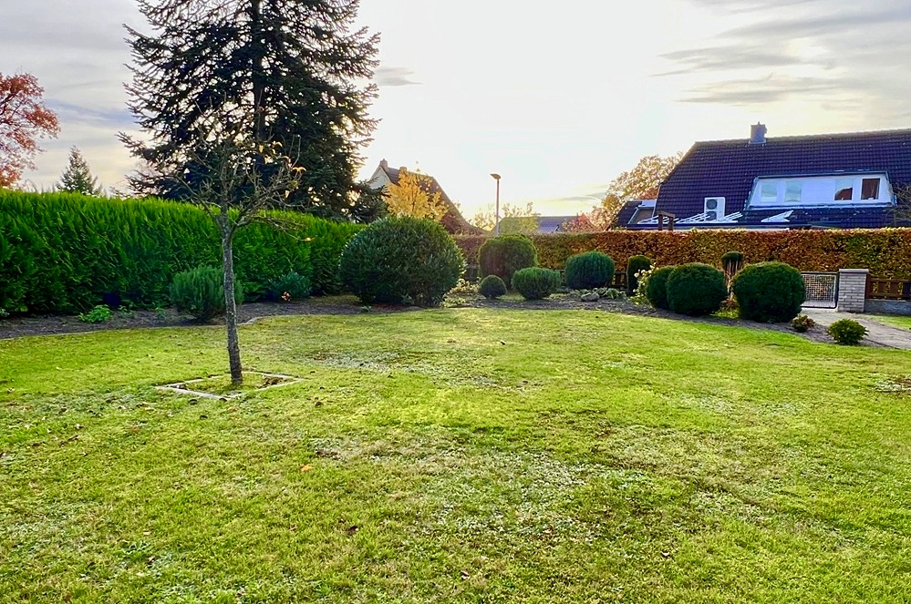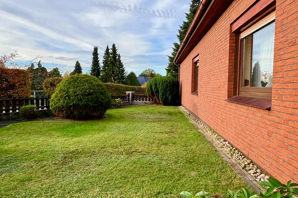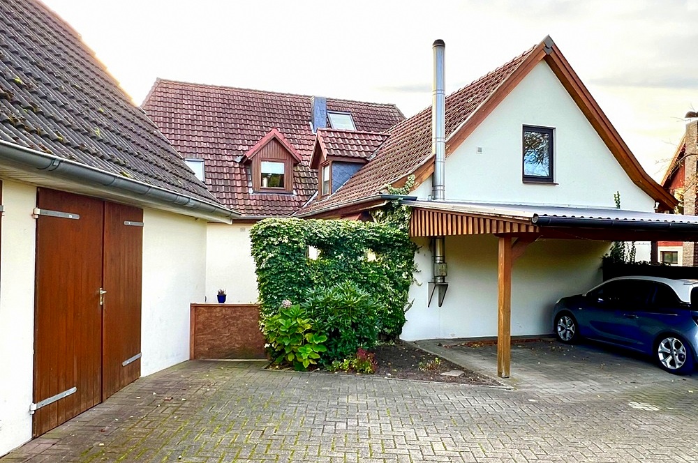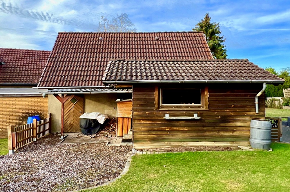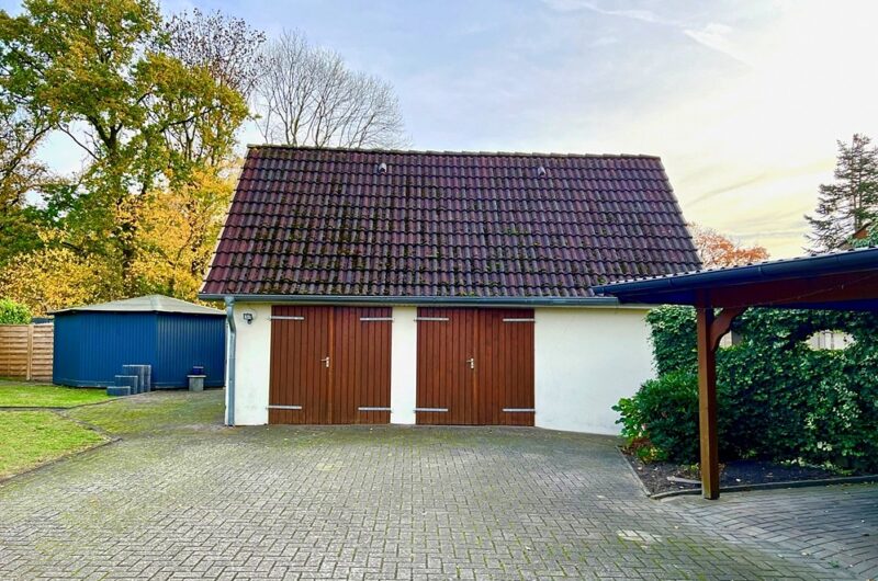 Auf dem großzügigen Grundstück befinden sich ein Doppel- und ein Einzelcarport sowie eine massive Doppelgarage mit Abstellraum. Im hinteren Bereich steht ein großes Gartenhaus, das zum Feiern genutzt werden kann. Daran angrenzend ist eine Terrasse mit Grillkamin angelegt.
