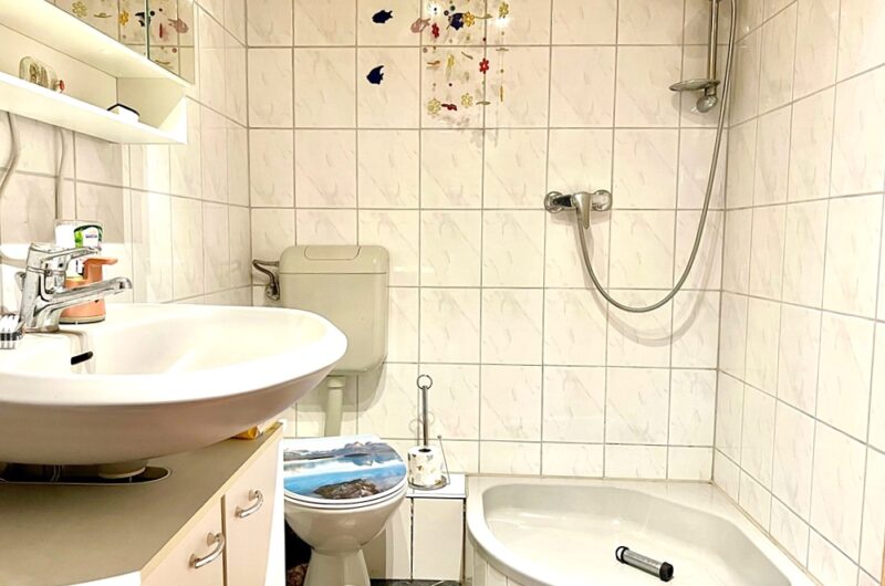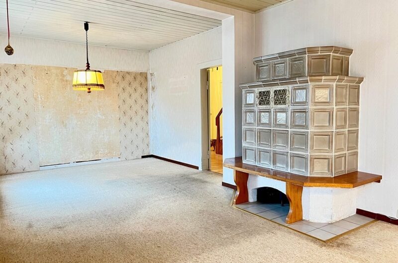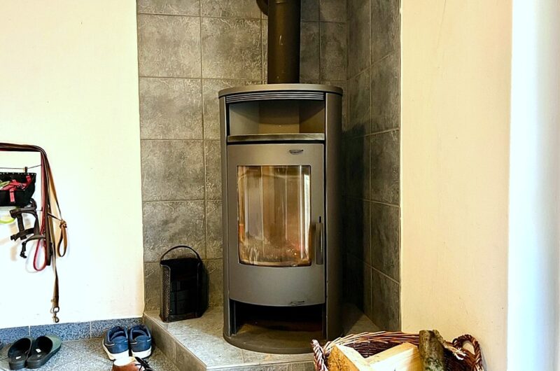 Der eigene Eingangsbereich im Erdgeschoss verfügt über ein Duschbad sowie über einen Kaminofen, der einen Teil der oberen Wohnung über das Treppenhaus mitbeheizen kann.