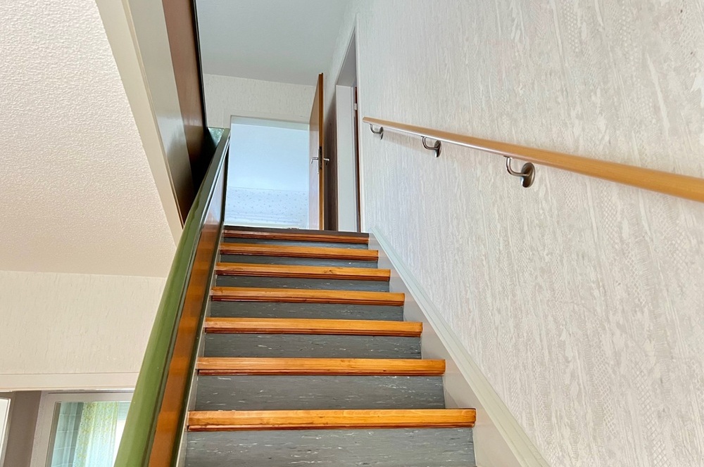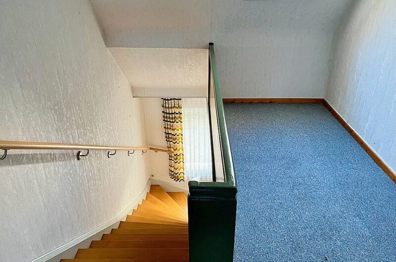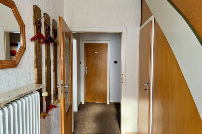 Vom gemeinsamen Hauseingang mit Vorflur aus führt eine Holztreppe in das zu einer Einliegerwohnung ausgebaute Dachgeschoss. Diese bietet ein barrierearmes Duschbad, das sowohl über den Flur als auch direkt vom daneben liegenden Zimmer einen Zugang hat. Das Zimmer (z. B. als Ankleide nutzbar) neben dem Bad hat auch eine direkte Verbindung zum großen Schlafzimmer. Zusätzlich gibt es eine Küche ohne Einbauküche sowie ein weiteres Schlafzimmer.