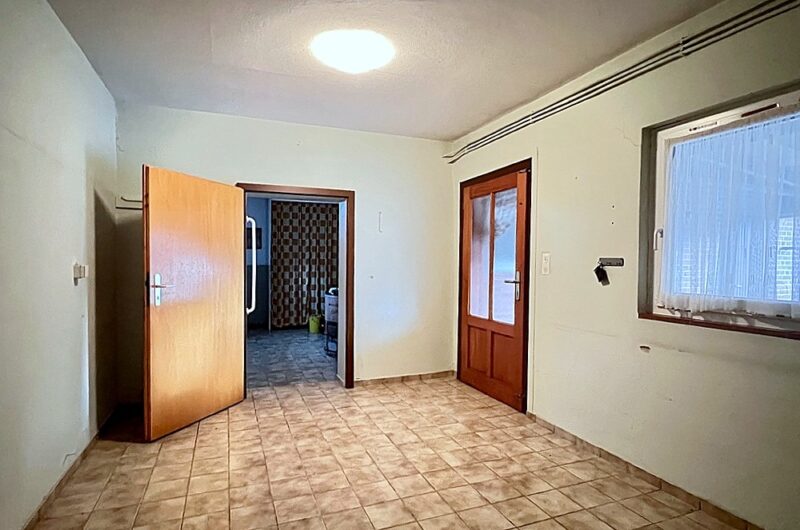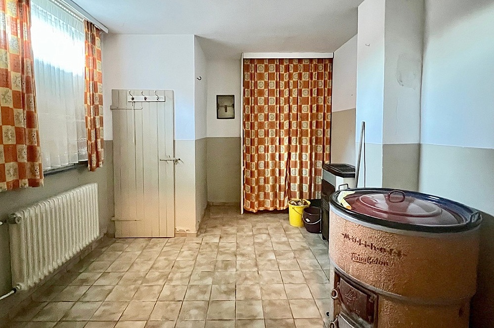 Das Erdgeschoss des Hauses bietet ein Wohn- Esszimmer mit einem alten Ofen (abgemeldet), eine geräumige Küche mit gepflegter Einbauküche und angrenzendem Vorratsraum, ein hell gefliestes Wannenbad mit Fenster sowie ein Schlafzimmer. Von der Küche aus gelangt man über einen geräumigen Zwischenbau zum daran angrenzenden Nebengebäude, in dem noch ein alter Waschkessel und eine alte Toilette ohne Spülfunktion (außer Betrieb) stehen. Des Weiteren ist hier eine ebenerdige Dusche installiert. Vom Zwischenbau aus gibt es einen Zugang zum Carport.